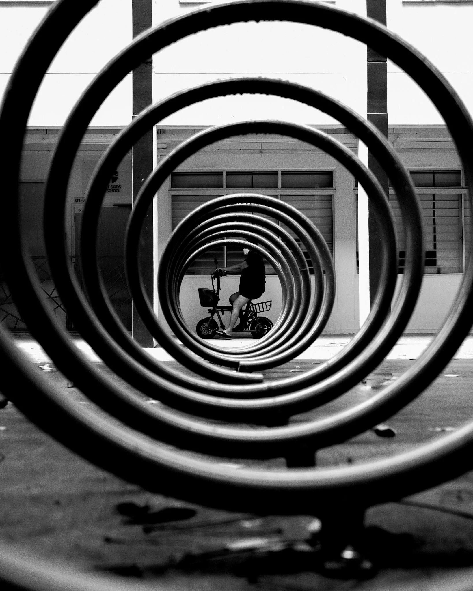 A woman on a bicycle framed by a series of concentric metal bike racks in an urban setting, black and white photo.