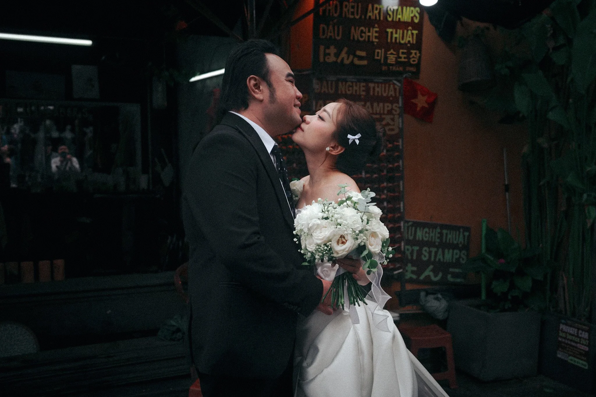 A bride and groom share a kiss or intimate moment in a dimly lit setting, with the bride holding a bouquet of white flowers.