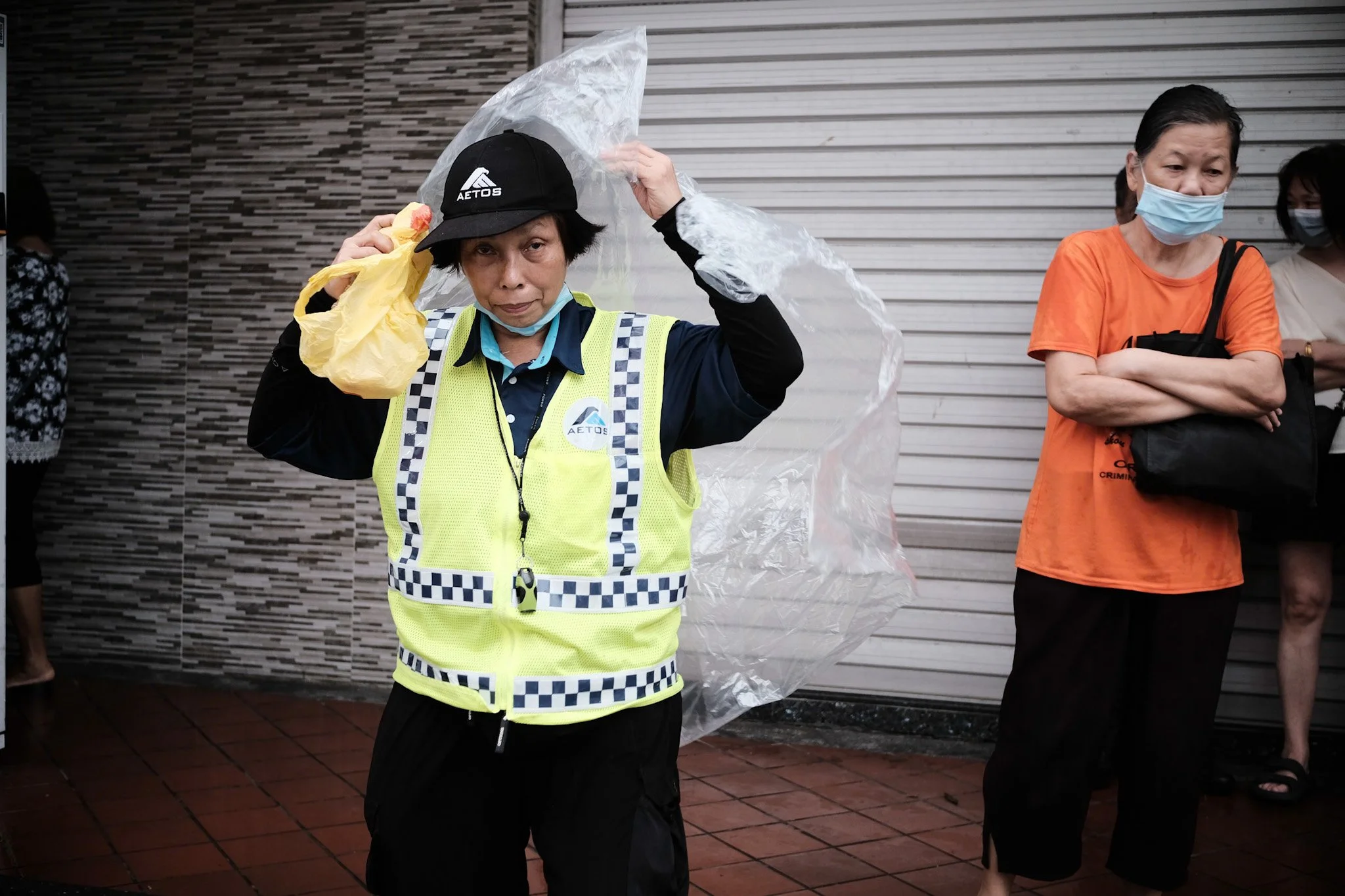 A woman wearing a high-visibility vest and a cap adjusting her face mask, with a plastic raincoat draped over her shoulder, standing on a wet brick surface alongside other people also wearing masks.