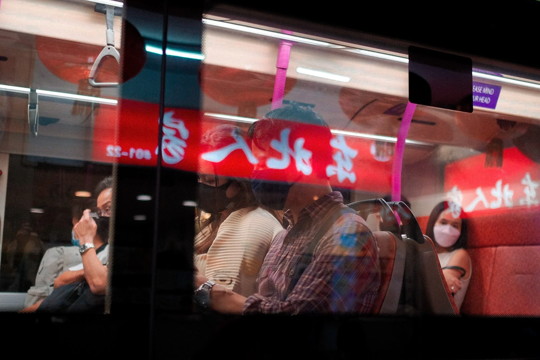 People sitting inside a bus wearing face masks, reflected through the window with Japanese signs and a neon purple strap visible.