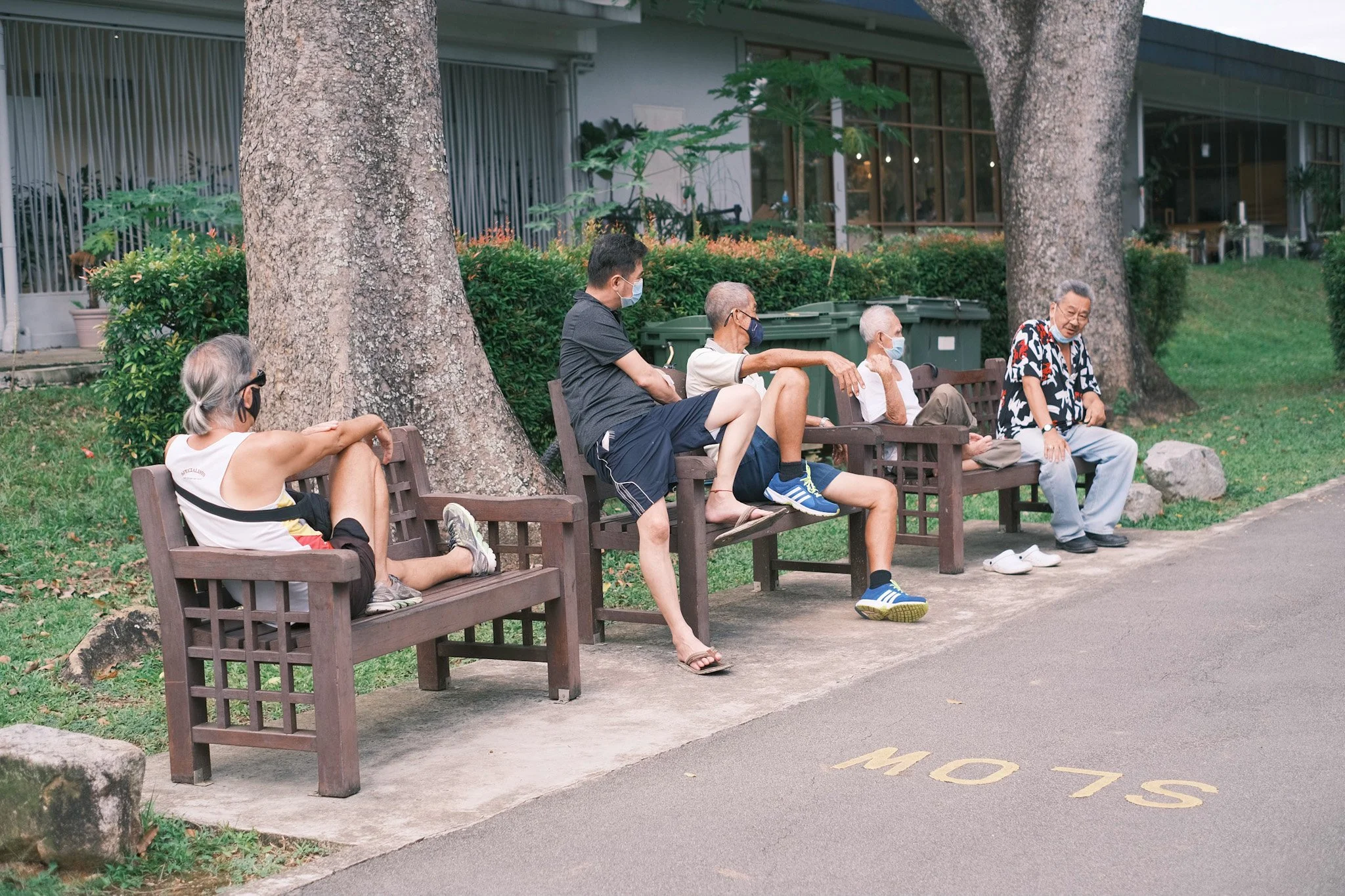 Five elderly and middle-aged people seated on benches along a sidewalk under large trees, all wearing masks. One is sitting on a bench with their legs crossed, another is with one knee up, and another is leaning back. The benches are near a grassy ar