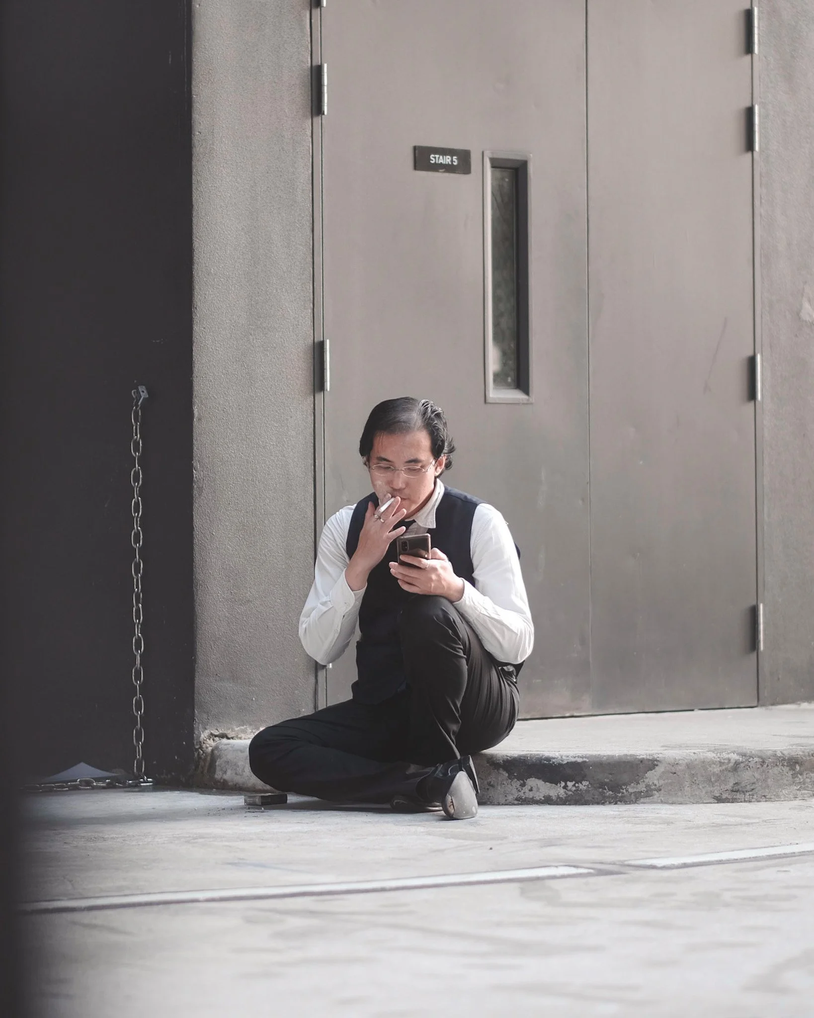 A man sitting on the ground outside a building, smoking a cigarette, and looking at his phone.