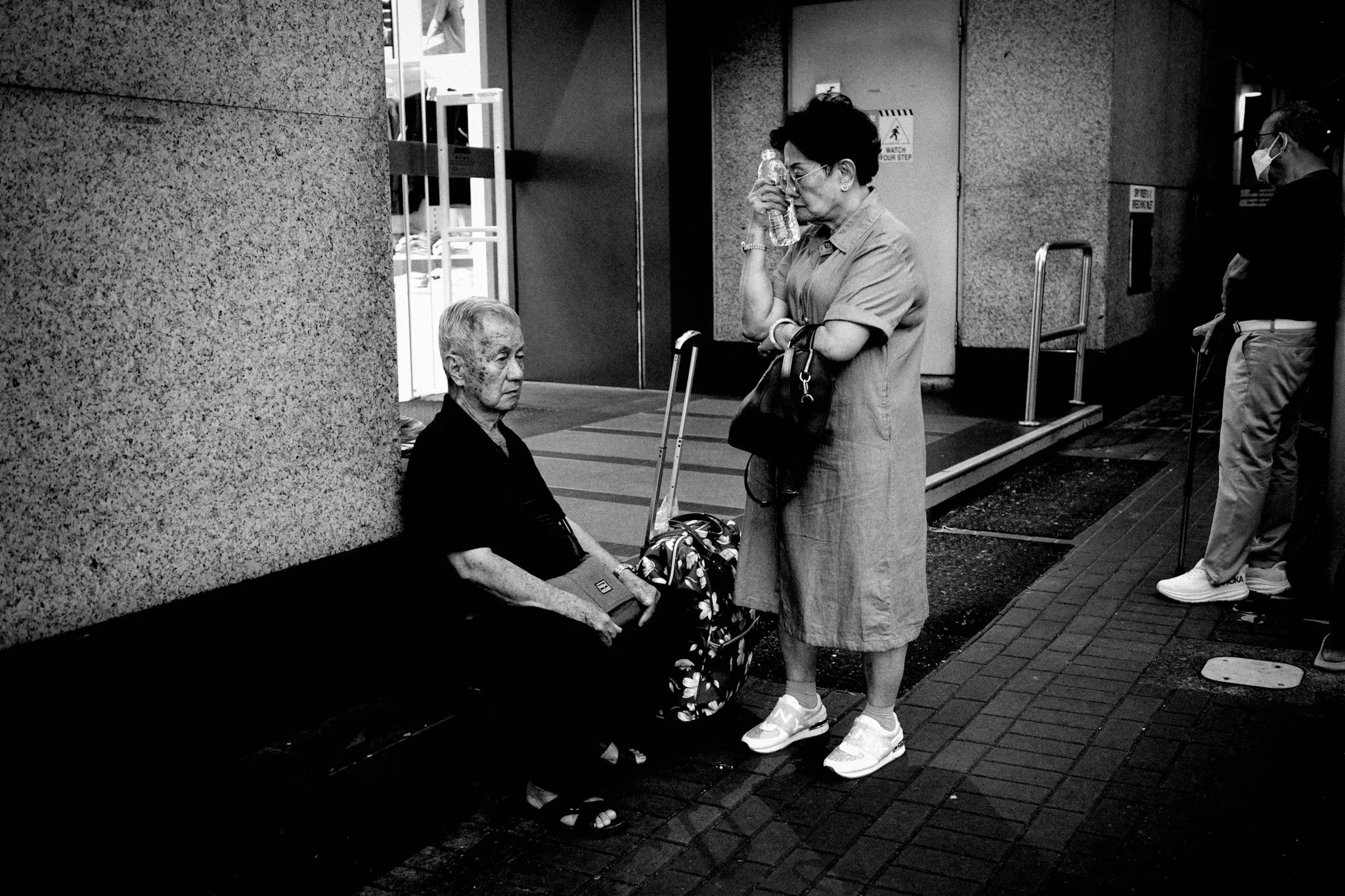 An elderly woman sitting on a bench with a bag on her lap, and a middle-aged woman standing in front of her, drinking water from a plastic bottle outside a building.