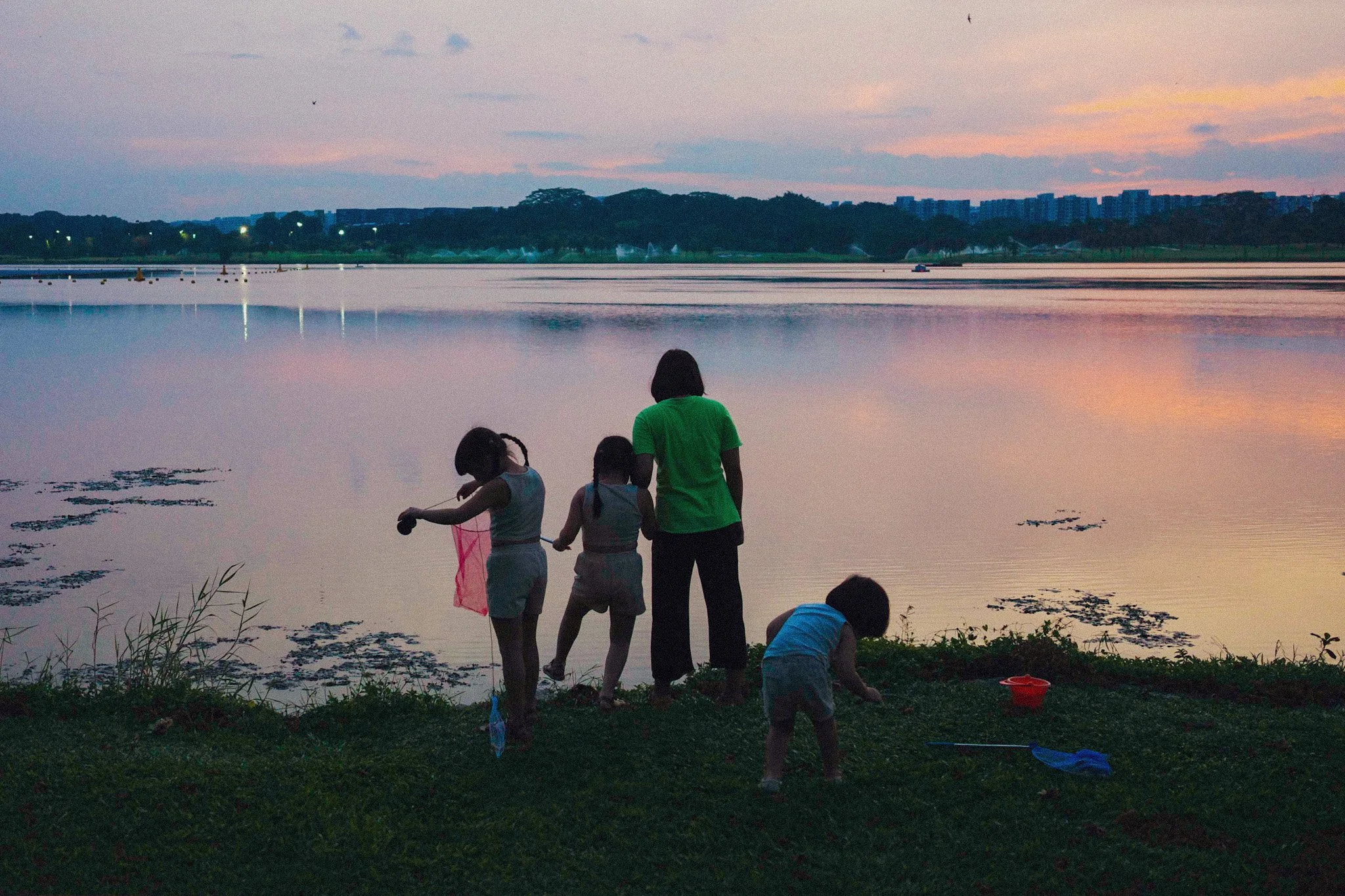 A family of five, including three children and an adult, enjoys fishing and playing near the edge of a calm lake at sunset, with city buildings in the distance.