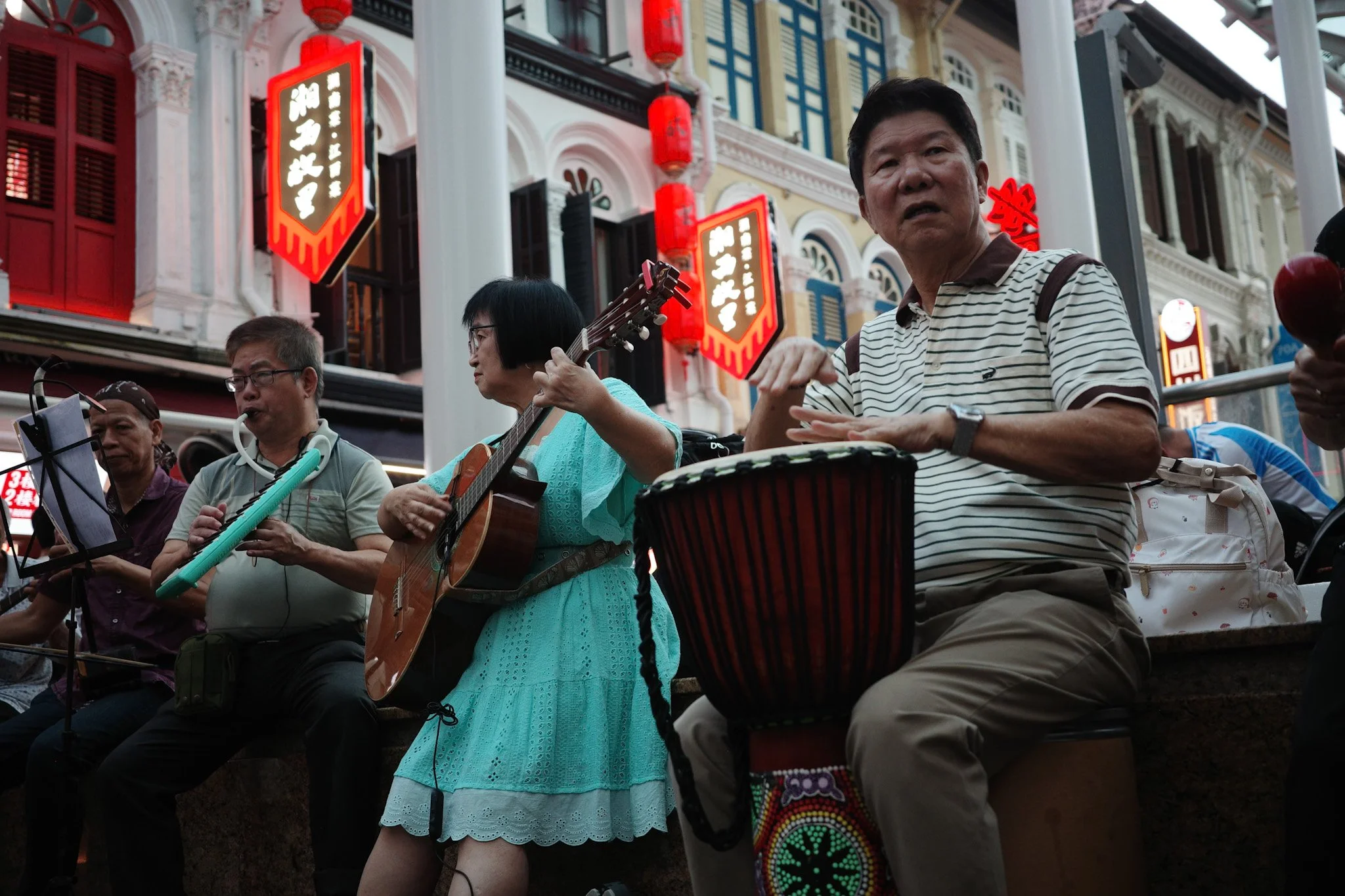 A group of street musicians performing in front of a building with Chinese lanterns and signs. The musicians include a man playing a drum, a woman playing a guitar, and another man playing a wind instrument. They are seated on a ledge. The scene appe