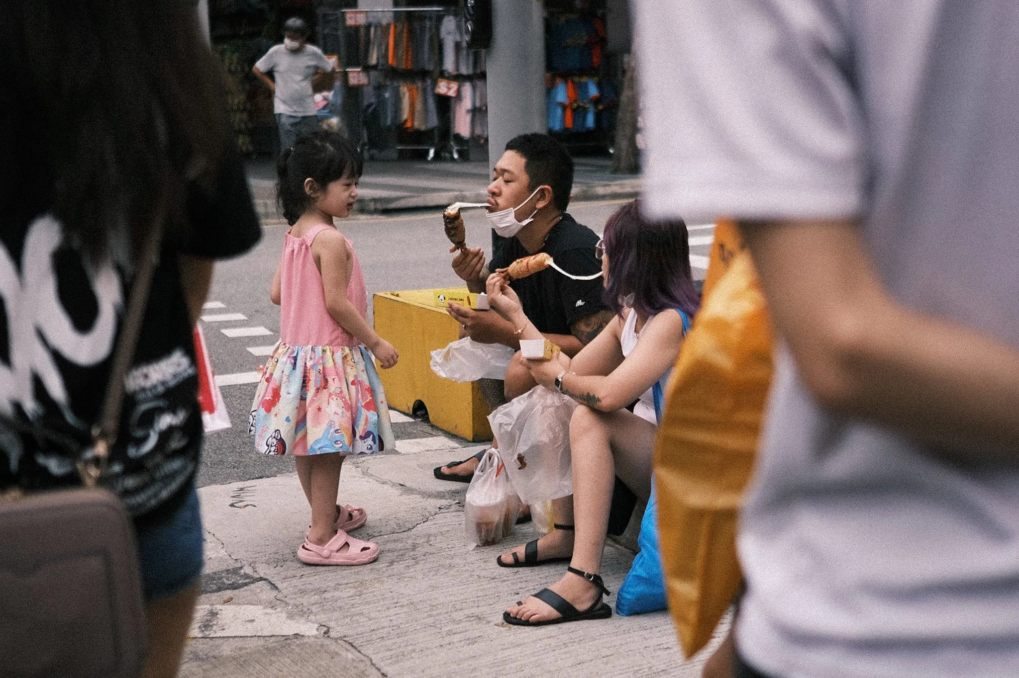A young girl in a pink dress interacts with two street vendors seated on the sidewalk, one man and one woman, who are selling grilled food. The vendors are wearing masks, and the woman has purple hair. The scene is on a city street surrounded by pass