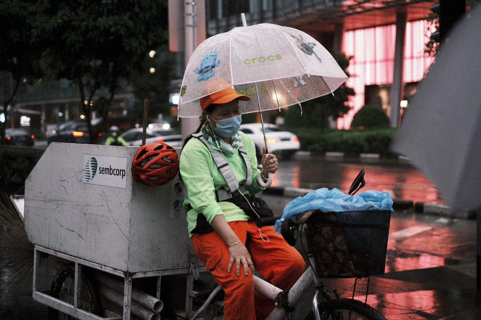 A person sitting on a pedicab during rainy weather, holding a transparent umbrella with cartoon characters, wearing an orange cap, green jacket, orange pants, and a face mask, with a delivery box and helmet behind them.