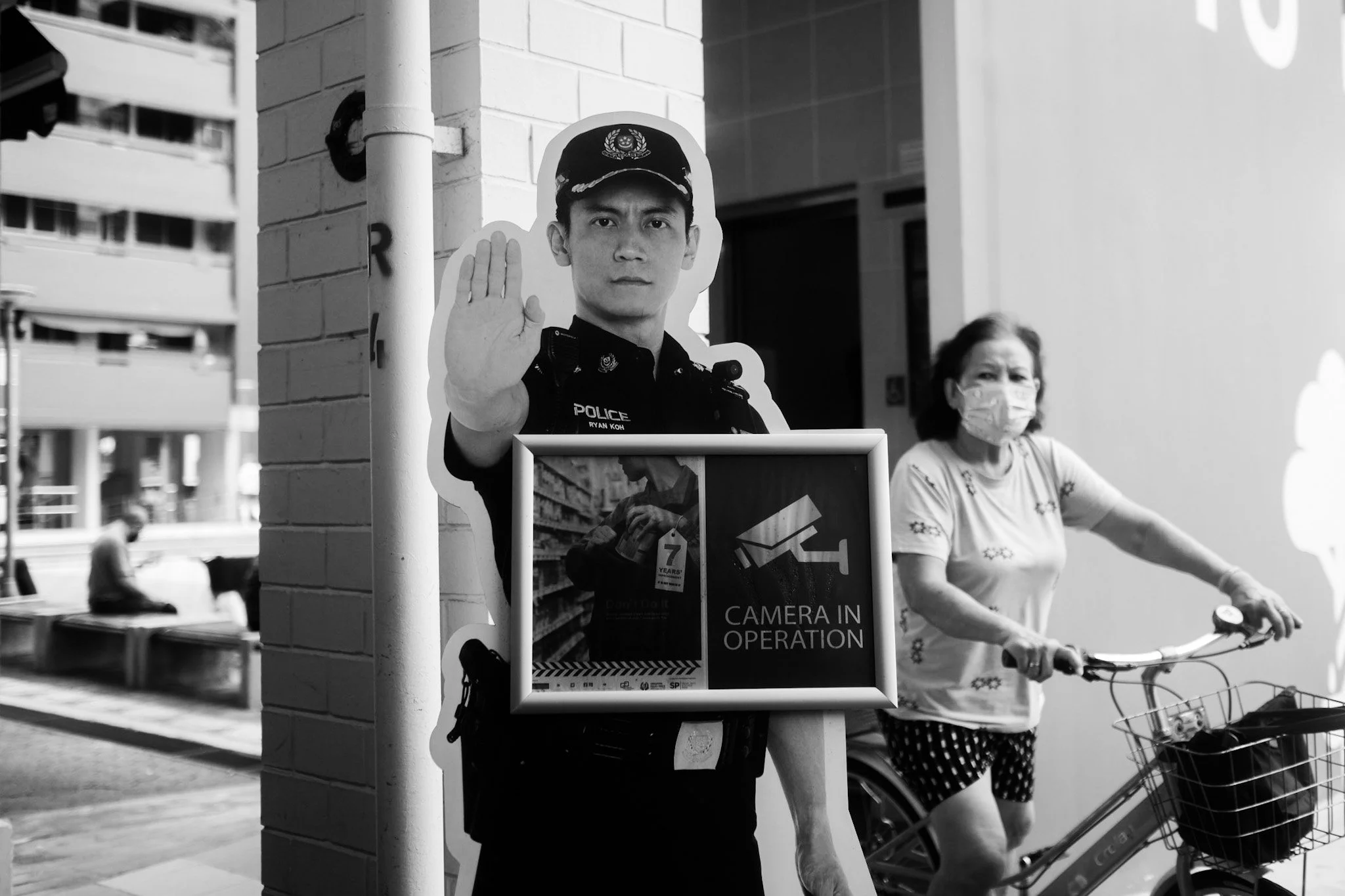 Black and white photograph of a police officer cutout with a raised hand, standing next to a sign that reads 'Camera in Operation,' and a woman riding a bicycle past it, wearing a face mask.