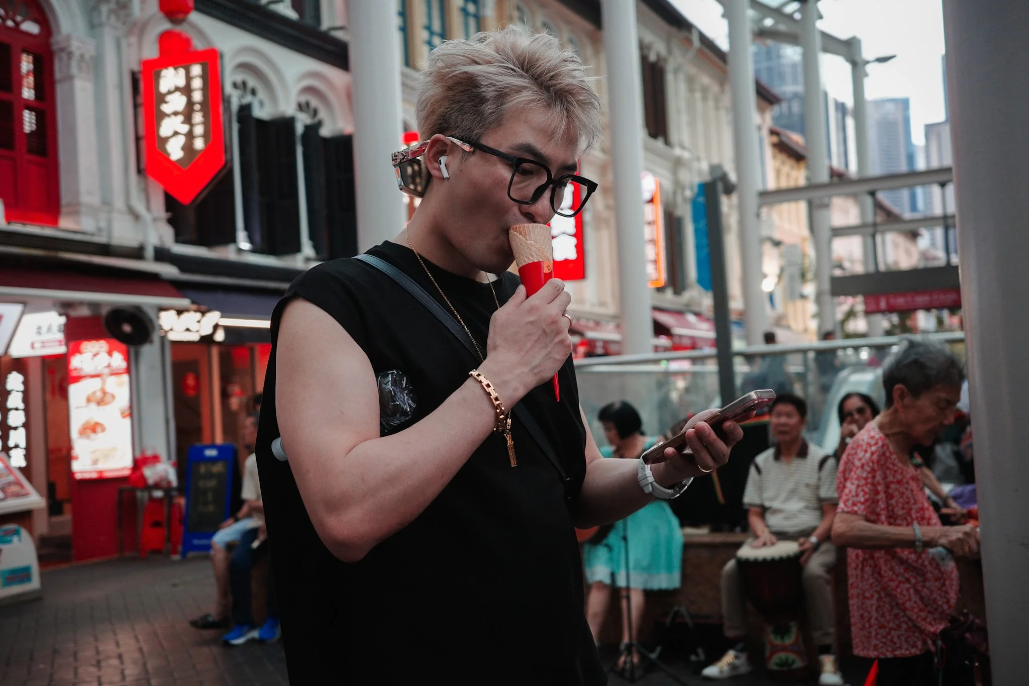 A person with blonde hair, glasses, wearing black sleeveless shirt, eating ice cream cone and looking at their phone on a busy city street with other people in the background.