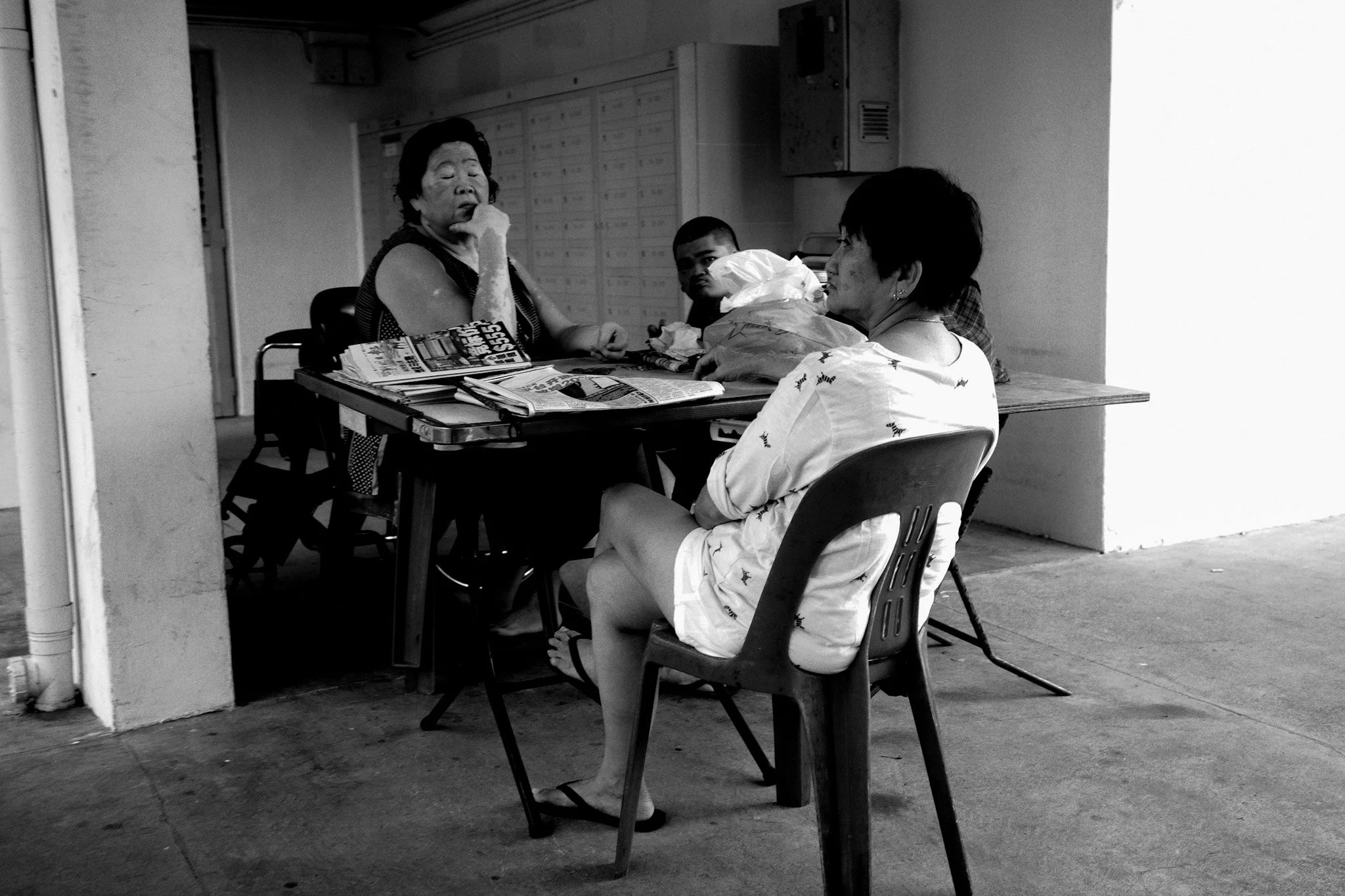 Black and white photo of three people sitting at a table in a lobby or waiting area, with mailboxes visible on the wall behind them.