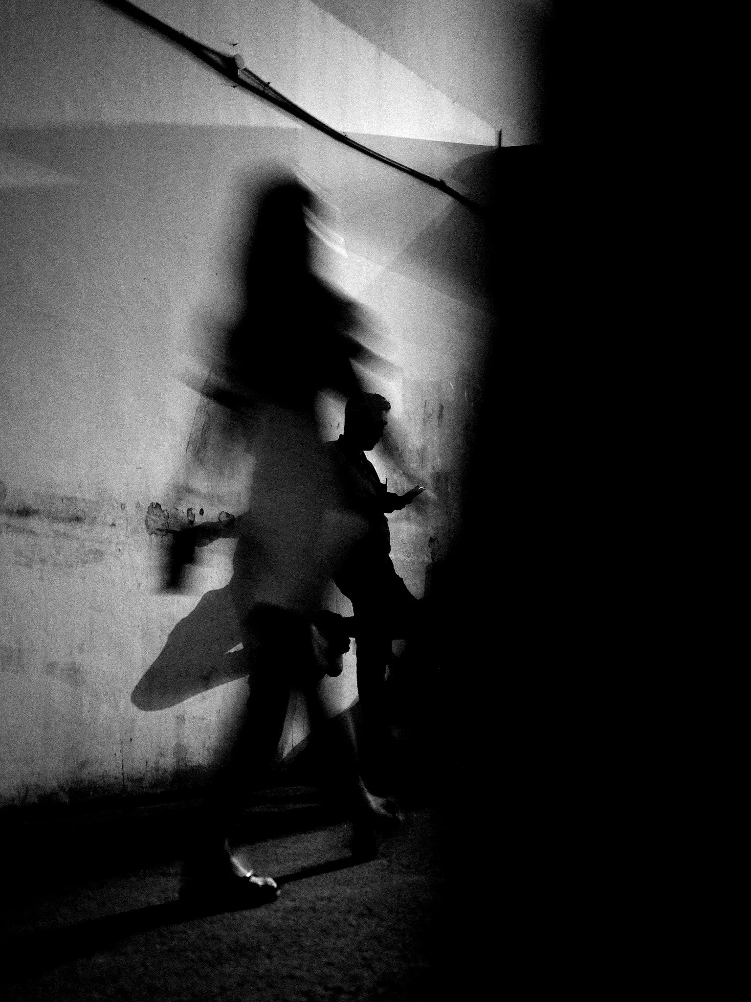 Silhouetted figures of a man and a woman against a wall. The woman is blurred as she walks past, and the man is sitting and looking at his phone.