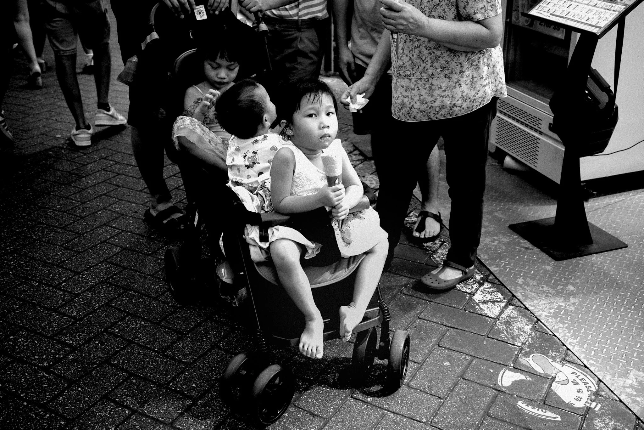 A young girl sitting in a stroller holding an ice cream cone, surrounded by other children and adults in an urban setting.
