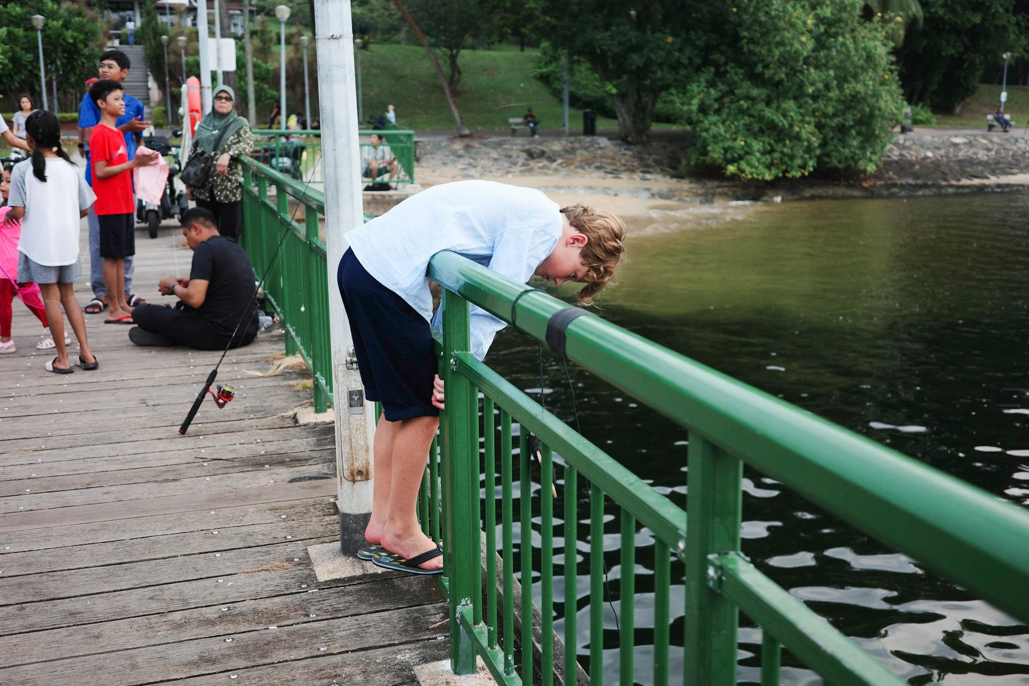 A young boy with curly blond hair, wearing a white shirt and dark shorts, leaning over a green railing on a wooden pier, looking at the water below.